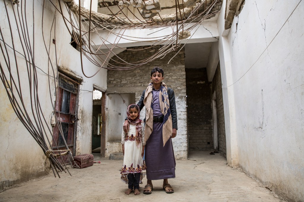 Yemen, gouvernorat de Saada, Haydan, mars 2018. Ayah (gauche) et Salah (droite) posent à l’intérieur de leur maison, bombardée par l’aviation saoudienne.