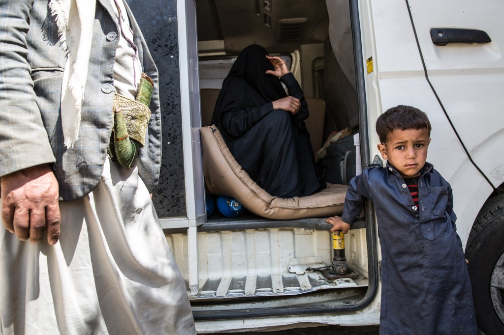 Yemen, gouvernorat d’Amran, Khamer, mars 2018. Une femme est en train d’accoucher dans un van devant l’hôpital de Khamer.