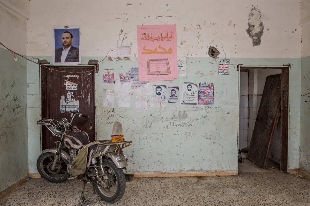 Yemen, gouvernorat de Saada, Haydan, mars 2018. En haut à gauche, le portrait de Saleh al-Samad, chef du Conseil politique suprême (Ansar Allah) à l’intérieur de l’école de Haydan, bombardée en 2016 par la coalition internationale dirigée par l’Arabie Saoudite et les Emirats arabes unis. Saleh al-Samad est mort dans un bombardement de la coalition le 19 avril 2018.